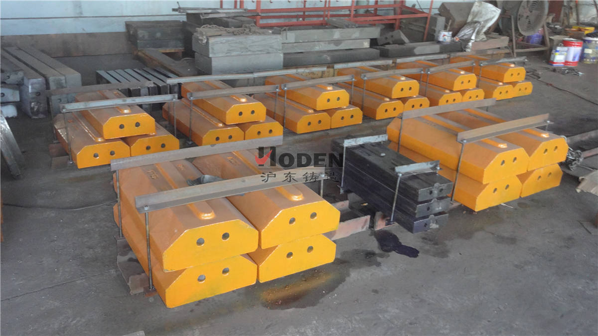 高鉻板錘高鉻鑄鐵所含主要元素為C、Si、Mn、S、P、Cr、Ni、Mo、Cu。碳是影響高鉻白口鑄鐵韌性最大的元素。由于碳與鐵、鉻、鉬等元素形成碳化物為高硬度相,如果它們呈網(wǎng)狀分布,更會(huì)加劇脆性, 因此, 高鉻抗磨鑄鐵的韌性主要取決于組織中的碳化物數(shù)量、形態(tài)、分布、大小。增加碳量, 可增加碳化物的數(shù)量,但會(huì)降低韌性和淬透性, 熱裂傾向增大。因此碳不能過(guò)高,一般認(rèn)為Cr/ C 為4~ 8時(shí), 耐磨性較好。 高鉻板錘高鉻鑄鐵含鉻量大于11%,鉻、碳含量比值超過(guò)3.5。在這種條件下,高硬度型M7C3碳化物幾乎全部代替了M3C型碳化物。
